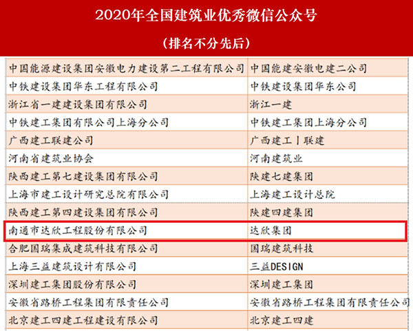 近日,由建筑時報社主辦的2020年建筑業(yè)微信公眾號運維經(jīng)驗交流研討會暨2020年全國建筑業(yè)優(yōu)秀微信公眾號頒獎典禮在揚州召開。會上,公布了2020年全國建筑業(yè)“最具影響力”微信公眾號和2020年全國建筑業(yè)優(yōu)秀微信公眾號榜單。達欣集團獲得2020年全國建筑業(yè)優(yōu)秀微信公眾號。