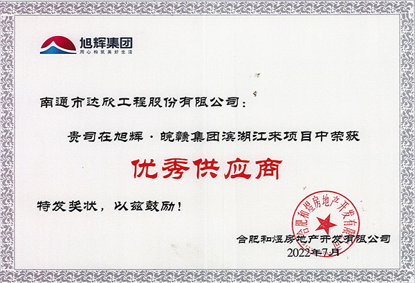 近日,旭輝·皖贛集團對2022年度優(yōu)質供應商進行表彰,集團第一工程公司在旭輝·皖贛集團濱湖江來項目中榮獲優(yōu)秀供應商稱號。