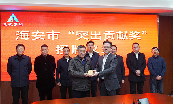 12月1日,海安高新區(qū)黨工委書記鄧加忠,黨工委副書記、管委會(huì)主任魯斌,黨工委副書記、科創(chuàng)園主任陸建銀,管委會(huì)副主任徐愛軍等領(lǐng)導(dǎo),為企業(yè)“2021年度入庫稅金超億元”,舉行“突出貢獻(xiàn)獎(jiǎng)”授牌儀式。這是繼去年集團(tuán)榮獲此項(xiàng)獎(jiǎng)牌后,再次受到當(dāng)?shù)卣挠忠淮渭为?jiǎng)鼓勵(lì)。集團(tuán)領(lǐng)導(dǎo)馬和軍、劉厚純等出席授牌儀式。