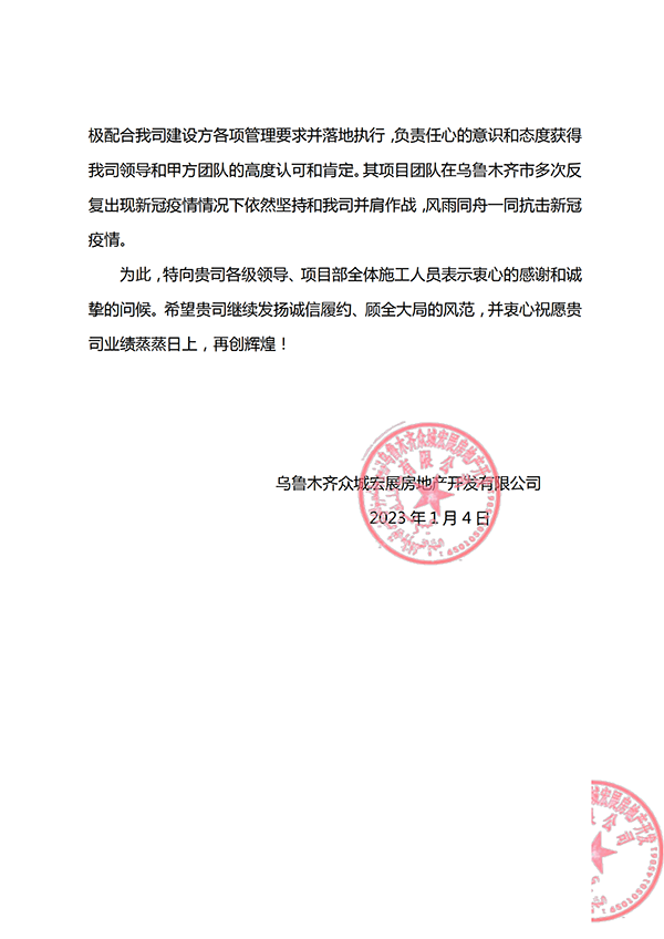 1月10日,集團(tuán)公司收到來自烏魯木齊眾城宏展房地產(chǎn)開發(fā)有限公司的一封表揚信,信中對集團(tuán)第十一公司烏魯木齊碧桂園·黃金時代二期工程項目部,自2022年8月10日烏魯木齊市實施新冠疫情防控以來,項目部全體人員在疫情防控和項目建設(shè)中表現(xiàn)出的責(zé)任與擔(dān)當(dāng)表示感謝。內(nèi)容詳見附件: