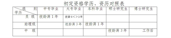 1、初定條件:大中專畢業(yè)生在所學(xué)專業(yè)與所從事工作的專業(yè)相同或相近的前提下,具備以下國家規(guī)定的相應(yīng)學(xué)歷、從事專業(yè)技術(shù)工作年限(表中簡稱“技齡”)的,可申請初定相應(yīng)級別的專業(yè)技術(shù)資格: