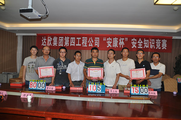 各項(xiàng)目部在建筑物上懸掛安全生產(chǎn)宣傳標(biāo)語24條幅;組織廣大職工觀看建筑施工中的事故案例,結(jié)合施工過程中的實(shí)際情況進(jìn)行分析點(diǎn)評(píng);對(duì)全體職工進(jìn)行了血壓檢測(cè);舉行了“安全生產(chǎn)月”主題簽名活動(dòng)。工程公司于6月8、9日在留村項(xiàng)目部組織所有在崗管理人員進(jìn)行了安全知識(shí)培訓(xùn)。6月22日工程公司舉行了“安康杯”安全知識(shí)競(jìng)賽,24名選手分8組參賽。經(jīng)過必答題、搶答題、附加題3個(gè)環(huán)節(jié)的比拼,最終眾美綠都項(xiàng)目部以領(lǐng)先笫二名25分的優(yōu)勢(shì)獲得冠軍,拉斐小鎮(zhèn)、留村莊園A區(qū)分獲二、三名。通過以上活動(dòng)的開展,進(jìn)一步提高了廣大職工的安全生產(chǎn)知識(shí)和安全意識(shí),確保安全生產(chǎn)。